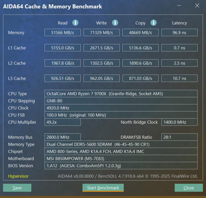 在AIDA64内存基准测试中,读、写、拷贝成绩分别达到51566MB/s、71329MB/s以及48669MB/s,延迟则是96.9ns。和真正“甜点频率”的6000 C28内存相比,带宽表现并没有落后太多,差距主要体现在延迟上。