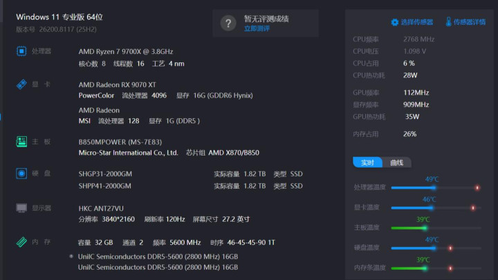 懂行的老司机肯定看出来了,亦逍遥频率非常接近AMD平台的“甜点”。为了试探它的深浅,这次直接弄了一套AMD全家桶(锐龙7 9700X处理器+RX 9070 XT显卡)来测试。作为一款广泛适配各家主板的内存,亦逍遥的兼容性表现也相当出色,开机轻松点亮。