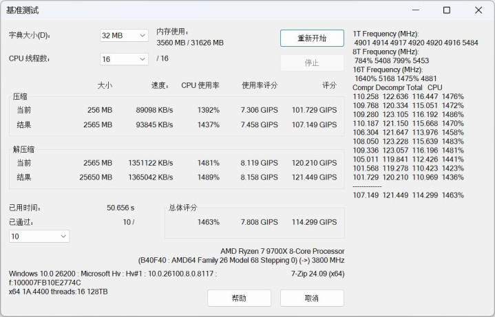 7 zip解压缩基准测试,字典大小设置32MB,评分成功破百来到114.299GIPS,使用率评分也接近8GIPS的优秀水平。